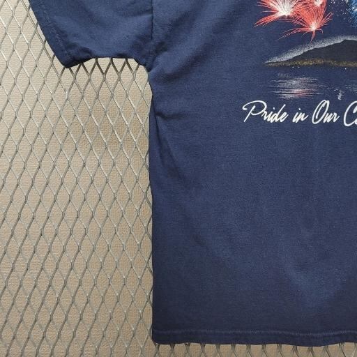 GILDAN(ギルダン)のUltra Cottonボディを使用した、ネイビーカラーのTシャツです。 バックプリントには、夜空に打ち上がる美しい花火と「Pride in Our Country」「Pride in Our Community」のメッセージがデザインされており、アメリカの愛国心や地域への誇りを感じさせる一枚です。フロントには「Hale VFD Department」の文字があり、Haleの消防署に関連するTシャツと推測されます。