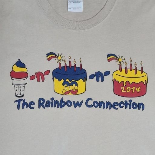 フロントには「The Rainbow Connection」のメッセージとともに、可愛らしいアイスクリームやケーキ、そして虹色のモチーフがデザインされています。2014年のイベントかコレクションのアイテムと推測され、レトロな雰囲気も魅力です。
