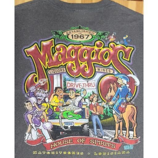 アメリカ、ルイジアナ州の酒店「Maggio's Liquors」の企業ロゴTシャツです。