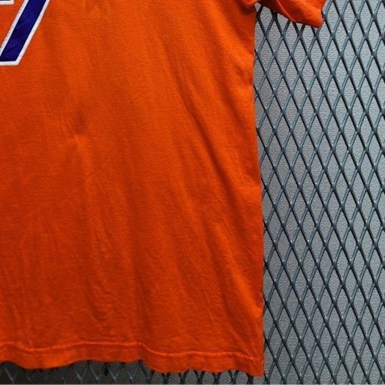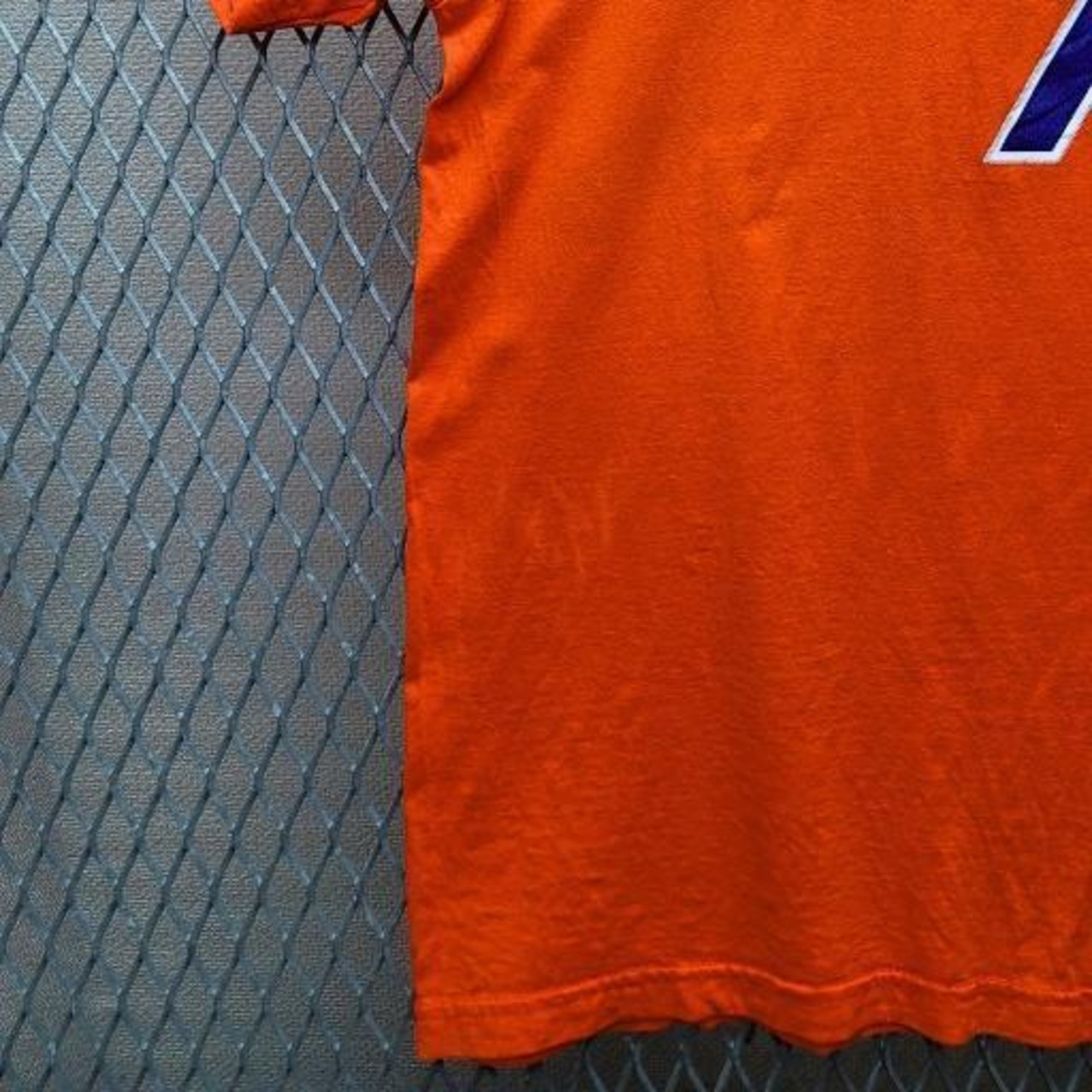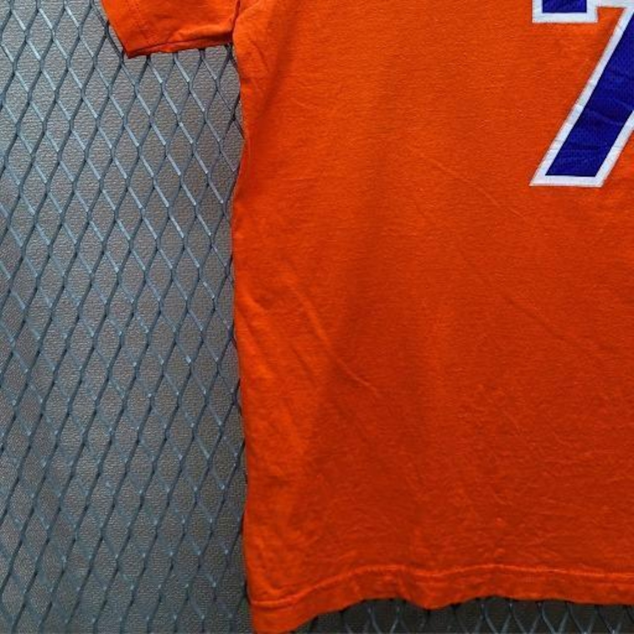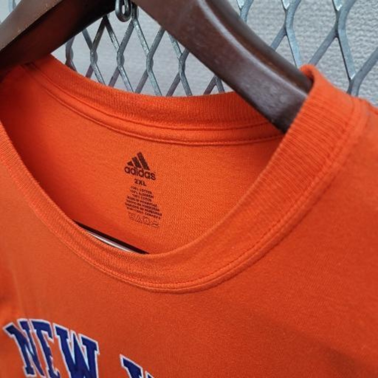 NBAニューヨーク・ニックスのスター選手、カーメロ・アンソニーの公式アディダスTシャツです。鮮やかなオレンジ色が目を引くデザインで、フロントには「NEW YORK」と背番号「7」、バックには「ANTHONY」と背番号「7」が大きくプリントされています。