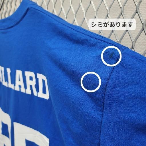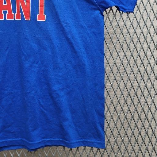 鮮やかなロイヤルブルーのボディに、カレッジロゴ風のプリントが映える一枚。