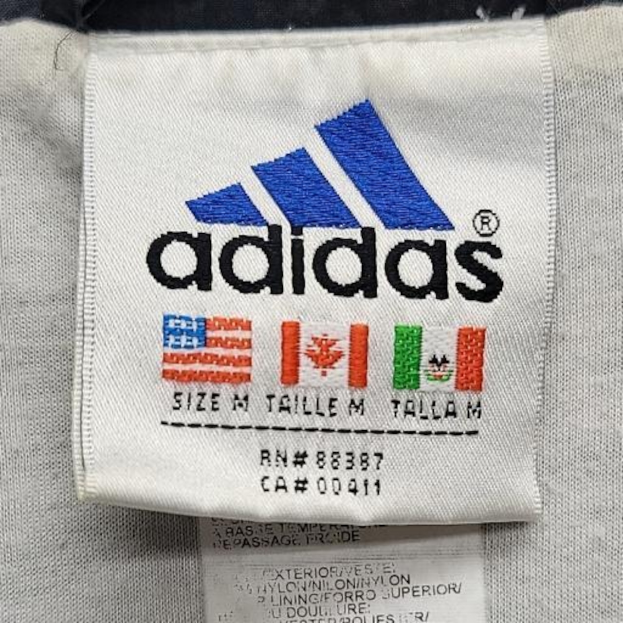年代: タグのデザイン(フラッグタグと呼ばれる多国籍な国旗が並ぶデザインとロゴ)や、製品番号(RN#88387 / CA#00411)から、1990年代のヴィンテージまたはオールドアディダスの製品であると思われます。